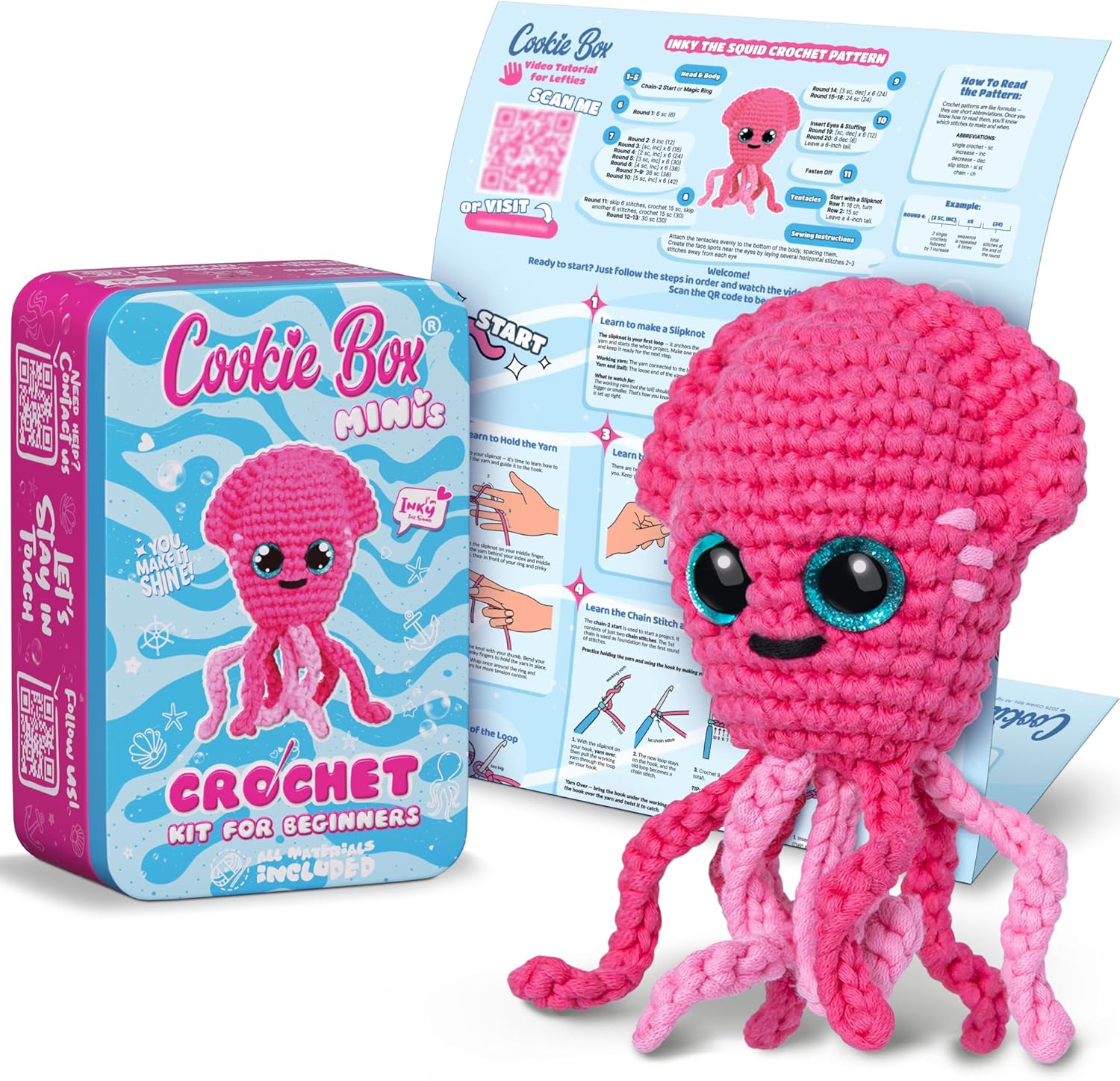 | Additional Features | Beginner-friendly yarn, metal storage tin, step-by-step PDF and video tutorials for righties and lefties, downloadable basic crochet techniques PDF guide |