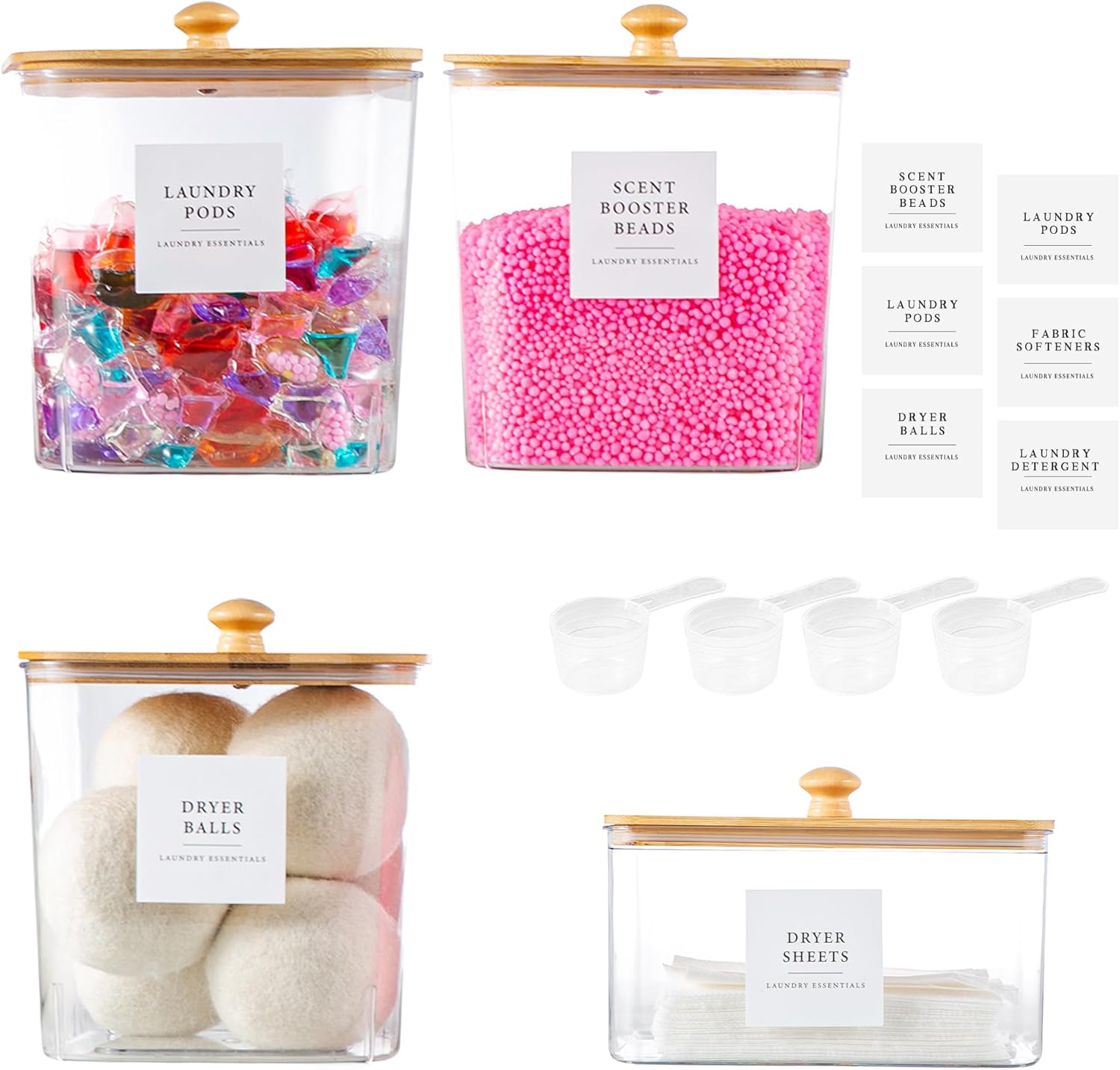 | Included Components | This laundry scent booster container set includes clear containers with wooden lids (0.66 Gal/84 OZ) x3,dryer sheet holder x 1, scoops x4, waterproof labels x16. |